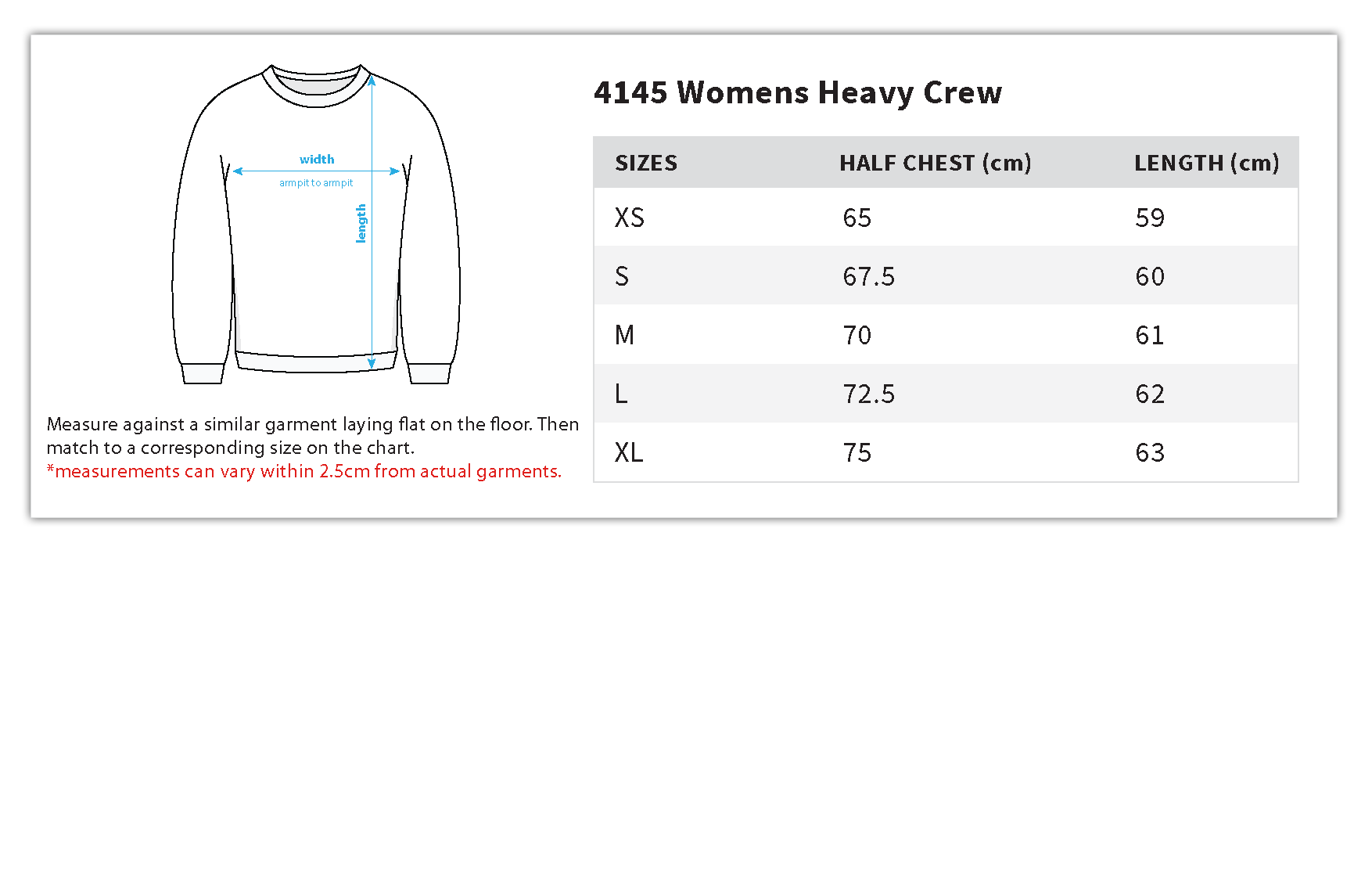 Construction: Pre-shrunk to minimise shrinkage, relaxed fit with dropped shoulders, inset sleeves, 2x2 ribbing on neck, cuff and hem.