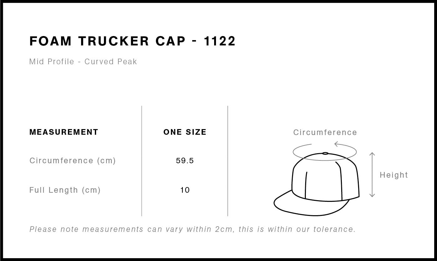Mid Profile 100% polyester foam front and peak, 100% Recycled polyester mesh back. Plastic snapback, tonal under-peak lining, mesh back. Tear-out AS Colour label.