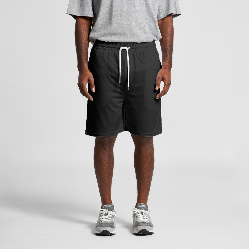 Construction: Perforated double-layer fabric shorts, on-seam side pockets, side splits at hem, elastic waistband, white drawcord with metal tips, preshrunk to minimise shrinkage