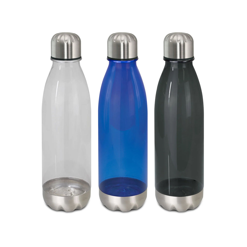 Trendy 700ml translucent drink bottle with a timeless design. It is manufactured from co-polyester which is odor-resistant and BPA-free. Mirage has a secure screw-on stainless steel lid, and a smart stainless steel base and can be presented in an optional black gift box. This product is not dishwasher safe and handwashing is recommended.