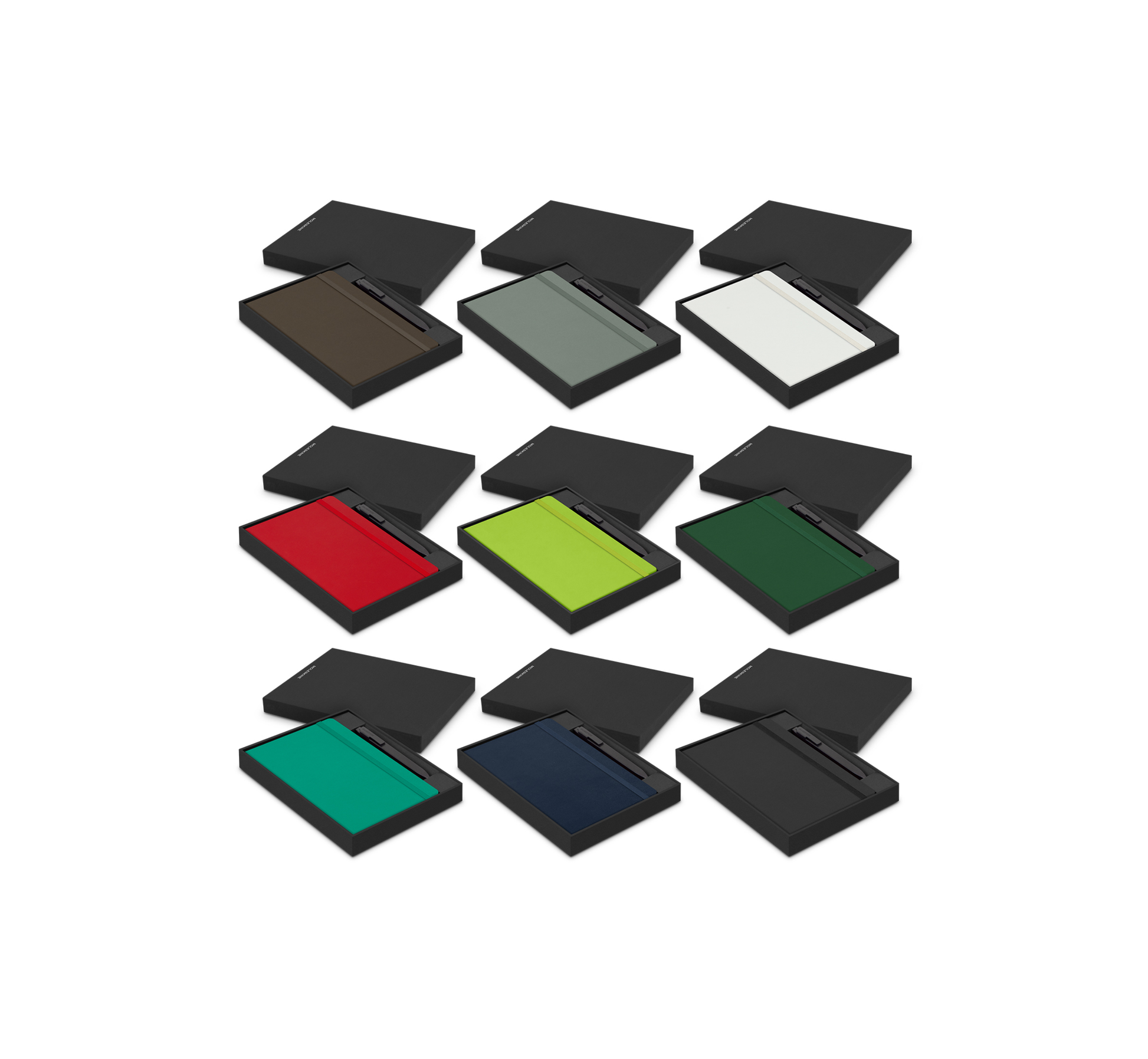 Premium Moleskine gift set which is presented in a smart black gift box. It includes a Large Moleskine Classic Hard Cover Notebook and a Moleskine Go Pen. The A5 notebook features 120 leaves (240 pages) of 70gsm Moleskine ivory-coloured lined paper with rounded edges, a bookmark ribbon, and an elastic closure for privacy. The Moleskine pen has a unique side opening clip that attaches firmly and neatly to any Moleskine hard cover notebook or planner. The Go Pen has a Moleskine refill with 3500 metres of black ink and a 1.0mm ballpoint tip for a smooth writing experience. Please note the notebook and pen cannot be supplied without the Moleskine logo. Moleskine reserves the right to decline any custom project or artwork that does not align with their brand on a case-by-case basis.