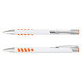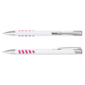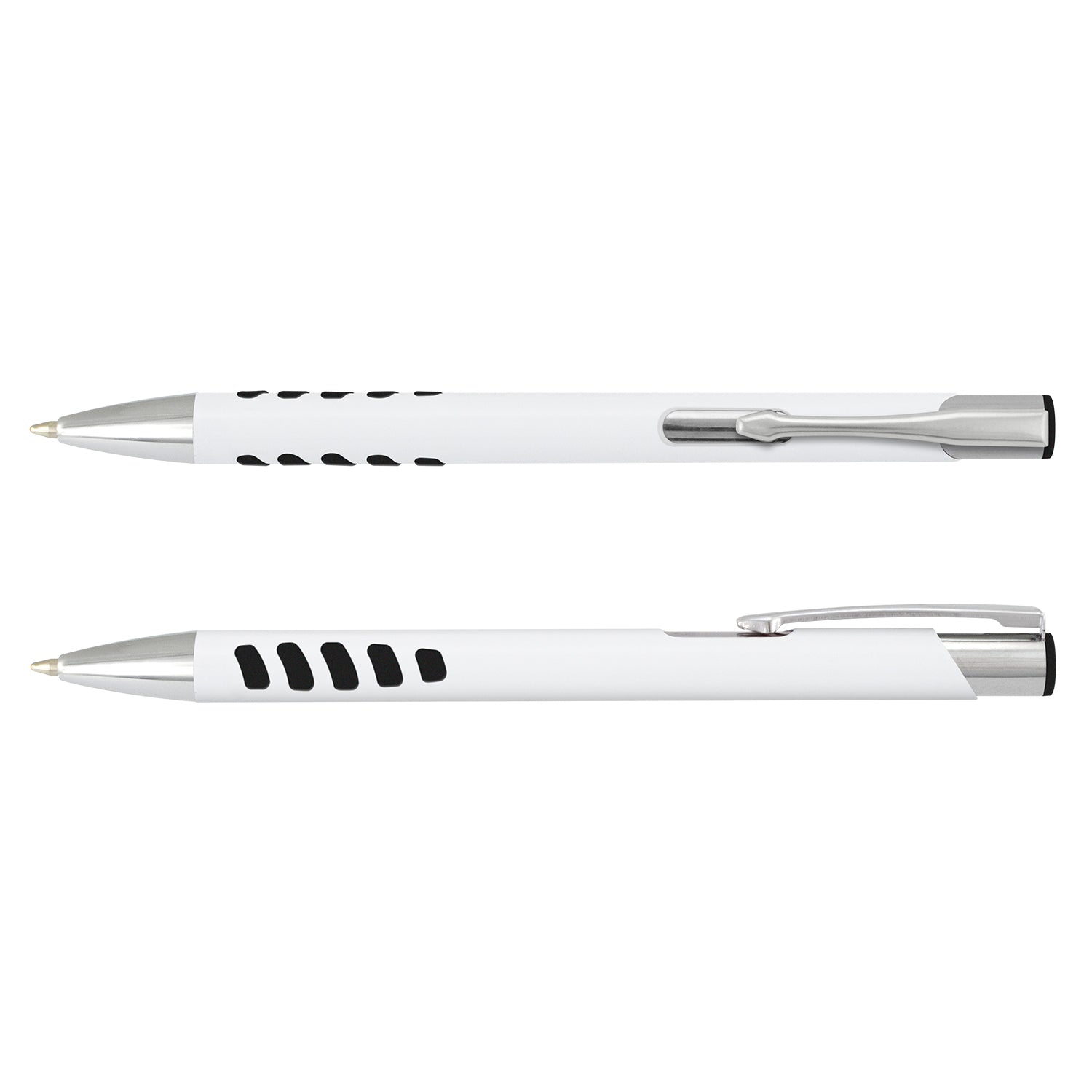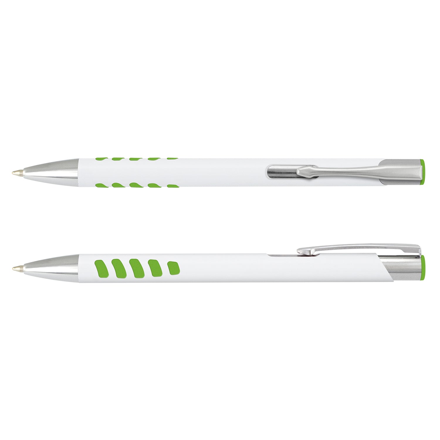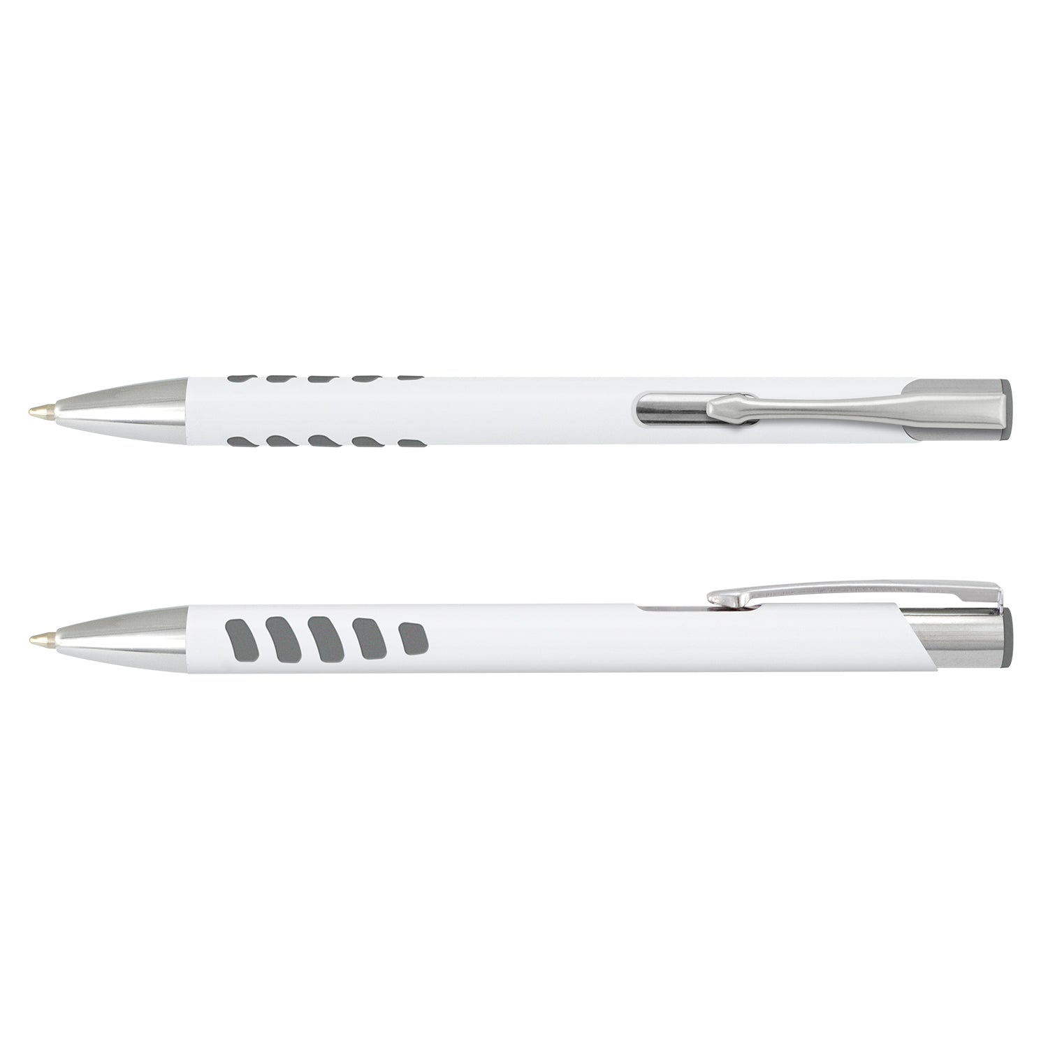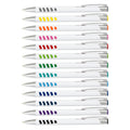 Retractable aluminium ballpoint pen with a painted gloss white barrel, shiny chrome accents and a coloured silicone grip with matching end cap. It has a large volume refill with 1200 metres of black German manufactured Dokumental ink.