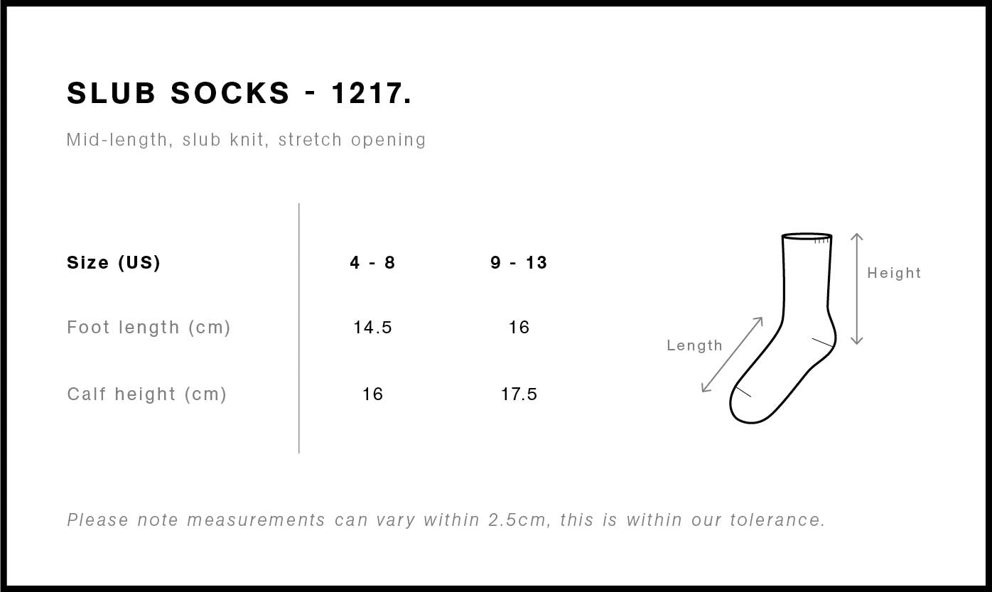 Construction: Regular-length, cotton-rich blend, stretch opening, circulation friendly, slub knit.