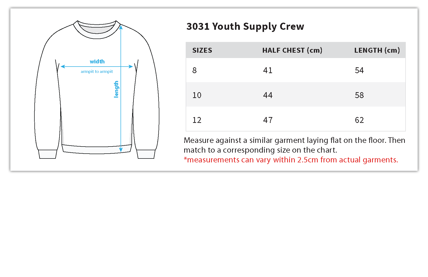 Construction: Crew sweat, raglan sleeves, neck and sleeve cuff ribbing, preshrunk to minimise shrinkage